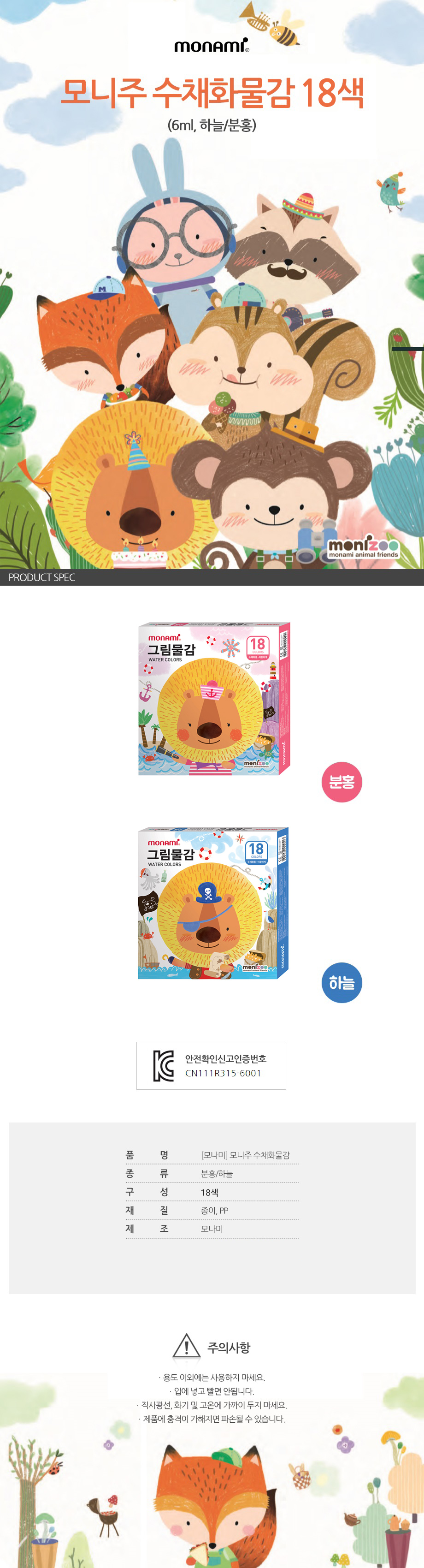 [모나미] 모니주 수채화물감 6ml 18색 (하늘/분홍 선택)