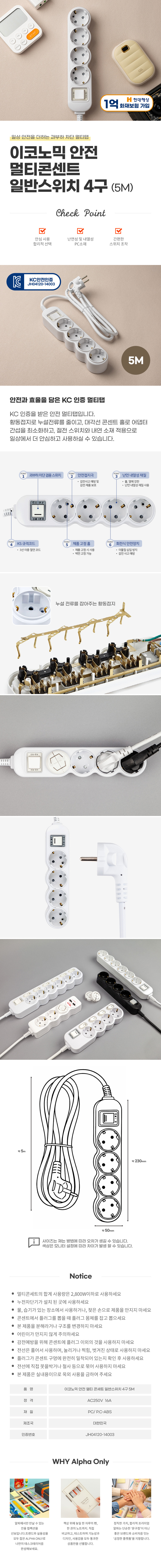 [알파] 이코노믹 안전 멀티탭 통합스위치 4구 5M