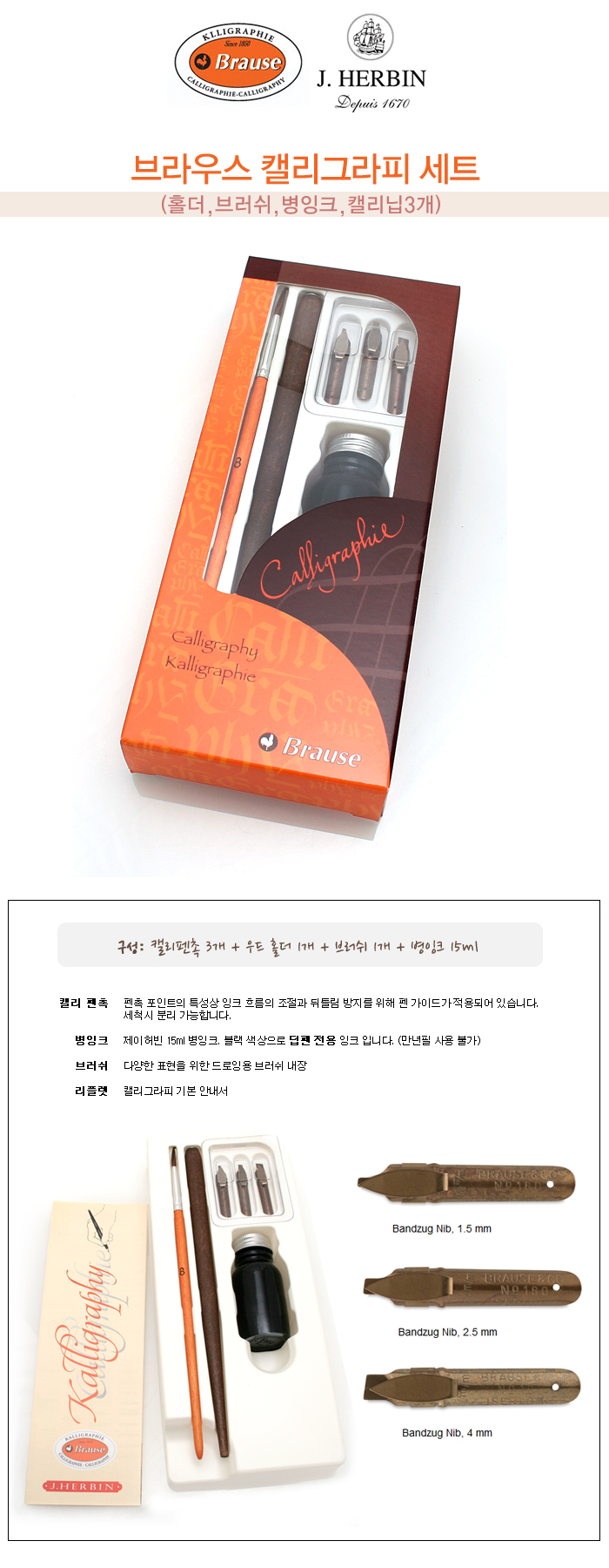 [브라우스]칼리그라피세트/147B/펜대1+펜촉3+붓+병잉크