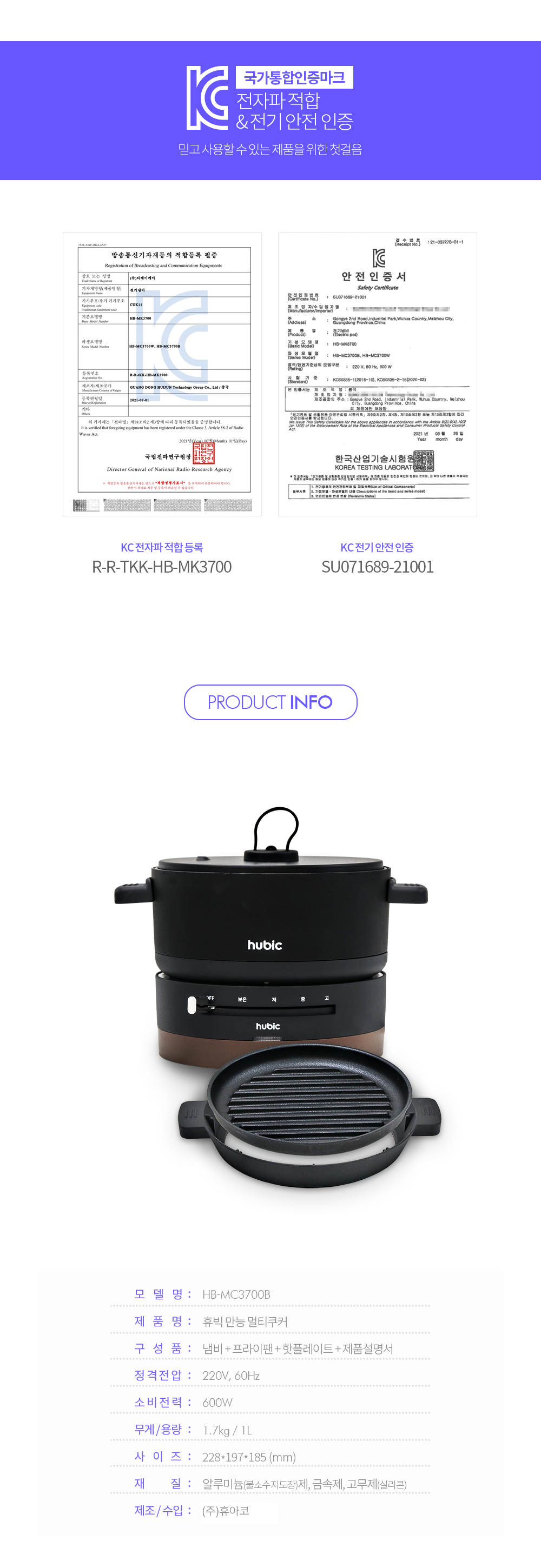 품명 및 모델명 : HB-MC3700B