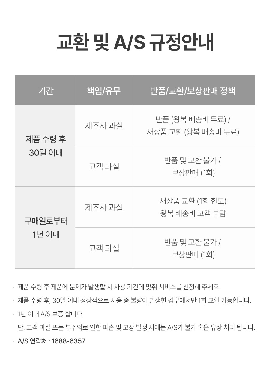 상품이 불량 및 하자인 경우 알파몰에서 왕복배송료를 부담하며,동일한 상품으로 교환됩니다