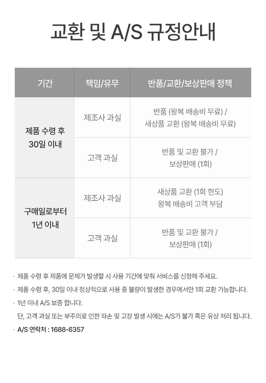 상품이 불량 및 하자인 경우 알파몰에서 왕복배송료를 부담하며,동일한 상품으로 교환됩니다