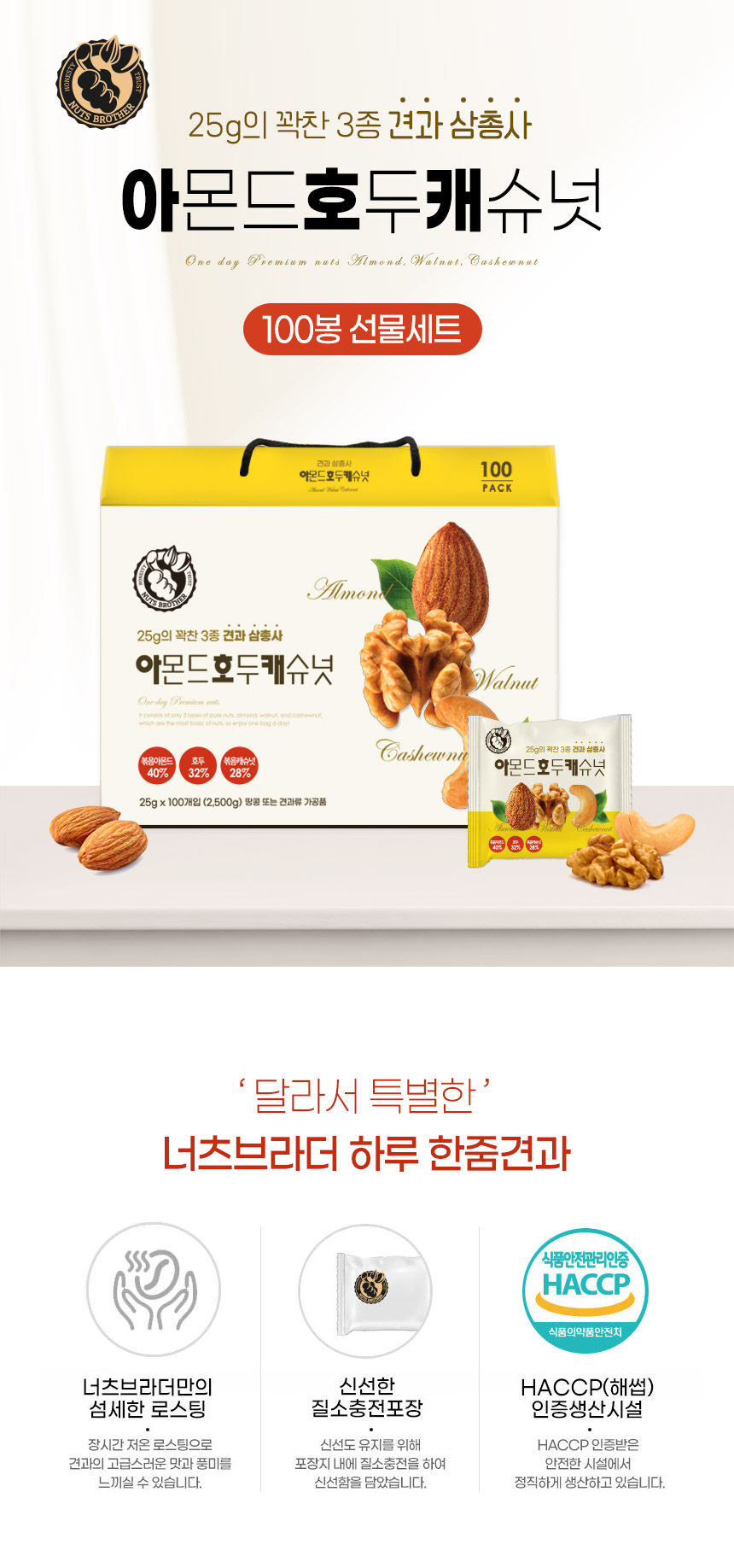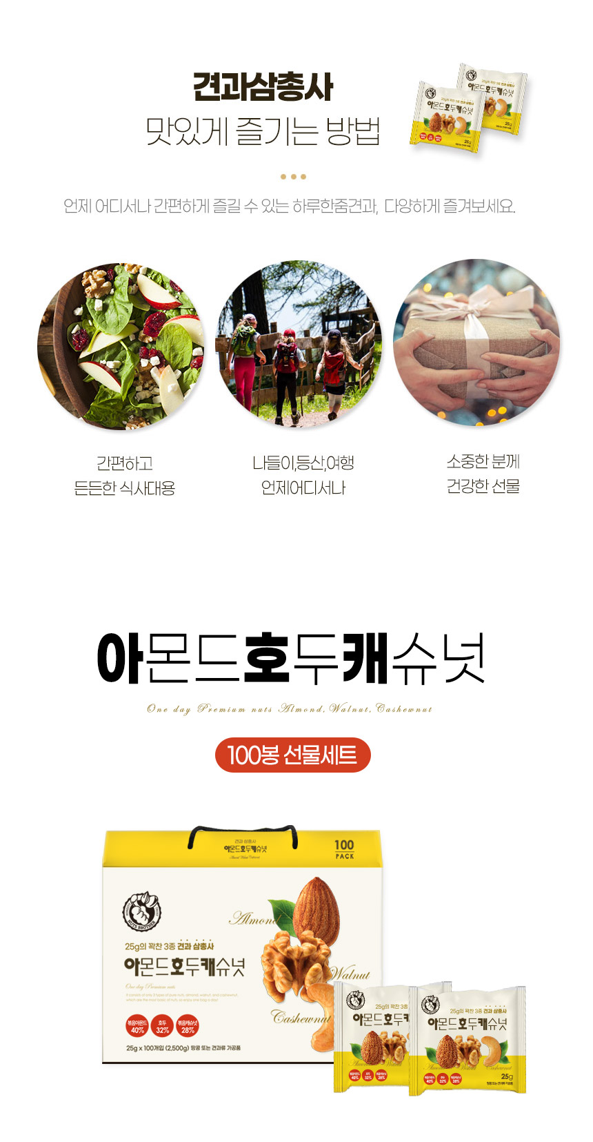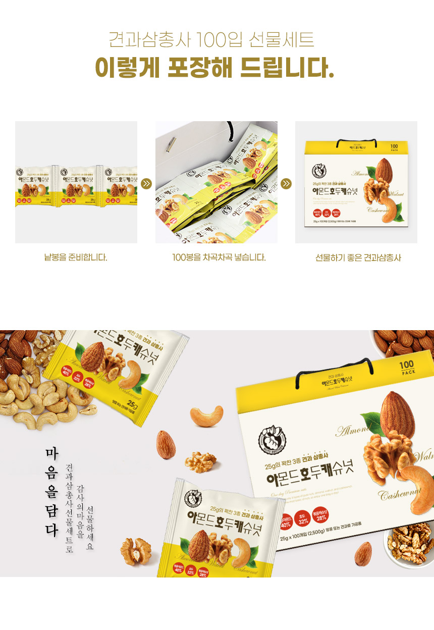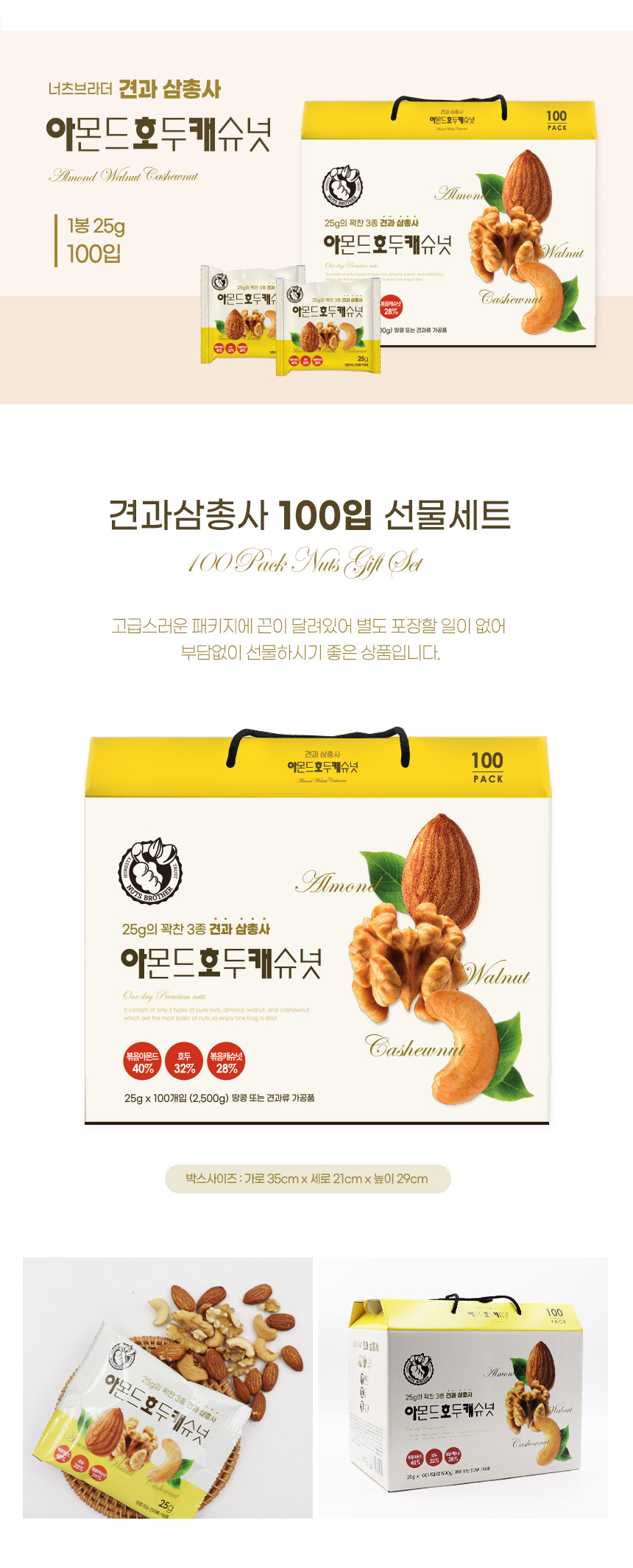 견과삼총사 아몬드호두캐슈넛 25g 100입 선물세트