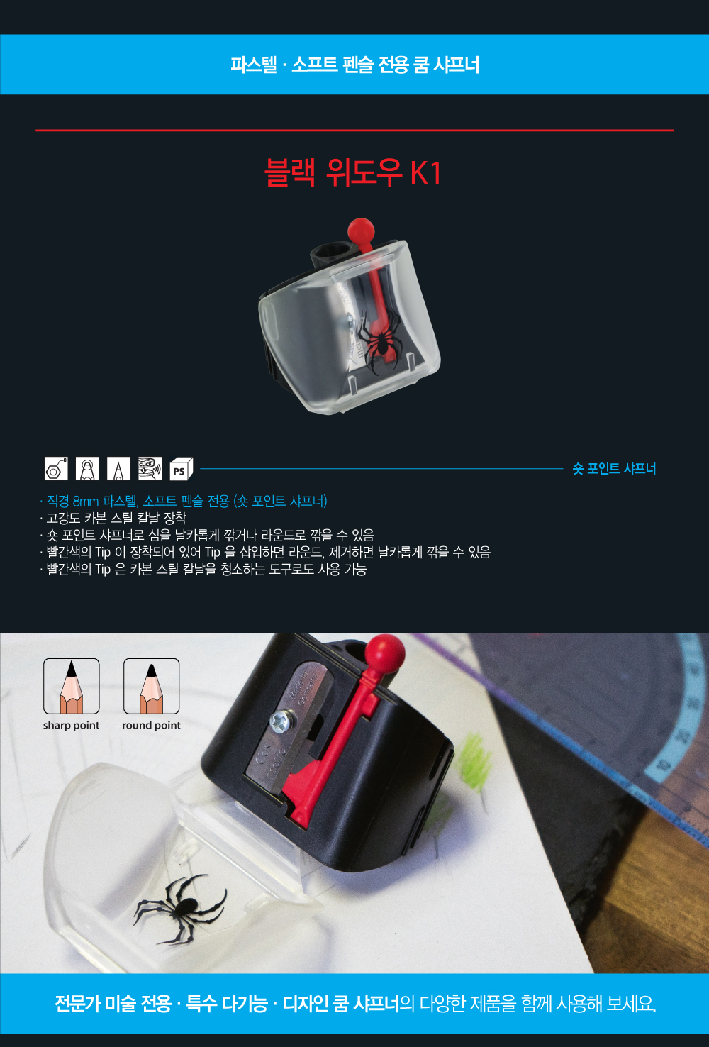 [2209179] KUM 샤프연필깎이 숏포인트 샤프너 연필심 조절 가능 블랙위도우K1