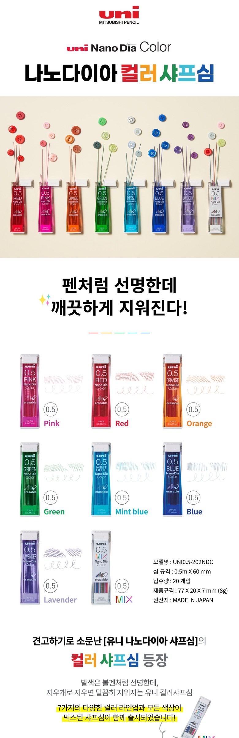 유니 컬러샤프심/나노다이아/UNI0.5-202DNC 0.5mm/Red 빨강